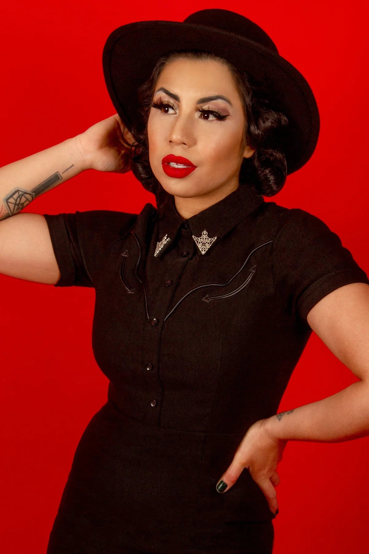 The Wanda Dress is your new wardrobe hero, designed to hug every curve with its stretchy, high-quality bengaline fabric. This playful little black dress features faux front buttons, a back zipper for easy wear, and sleek pleather piping that adds a touch of edge. Top it off with two removable silver collar clips for a fun Western flair. Comfortable, flattering, and ready to turn heads through every season! Just wash in cold water and hang to dry for lasting style.