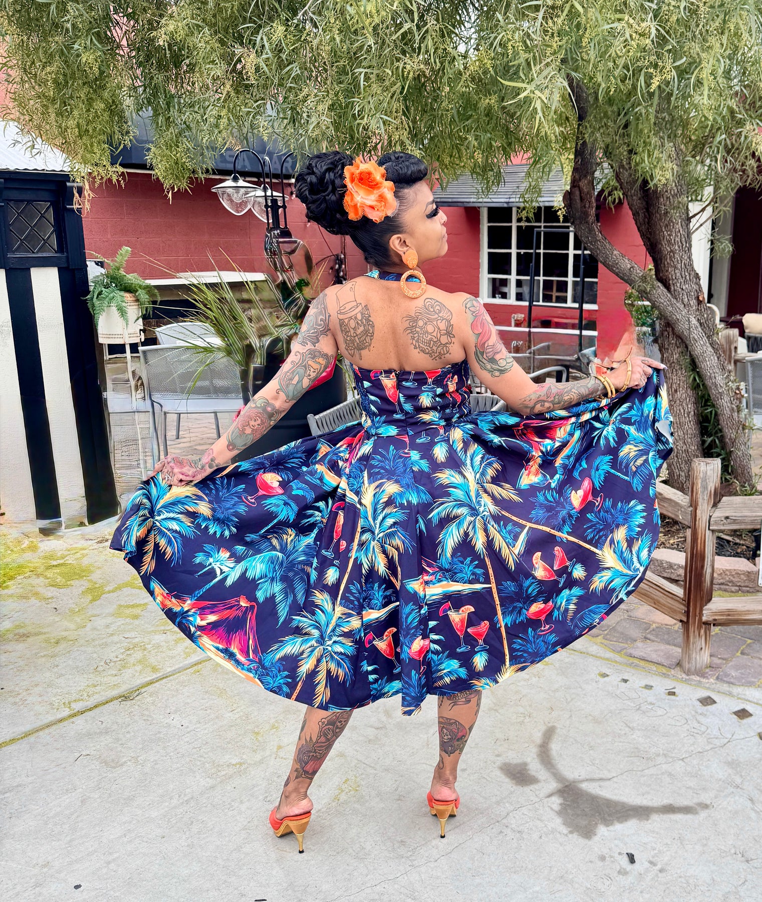 Escape to paradise in our Beachcomber Swing Dress, featuring an exclusive Island Dream print bursting with tropical vibes, refreshing cocktails, and swaying palms. This retro-inspired beauty combines a custom design with flattering side shirring and functional pockets—because adventure shouldn't mean sacrificing style. Whether you're lounging beachside or exploring island hideaways, this dress delivers vintage charm with modern comfort. Pack it, wear it, love it!